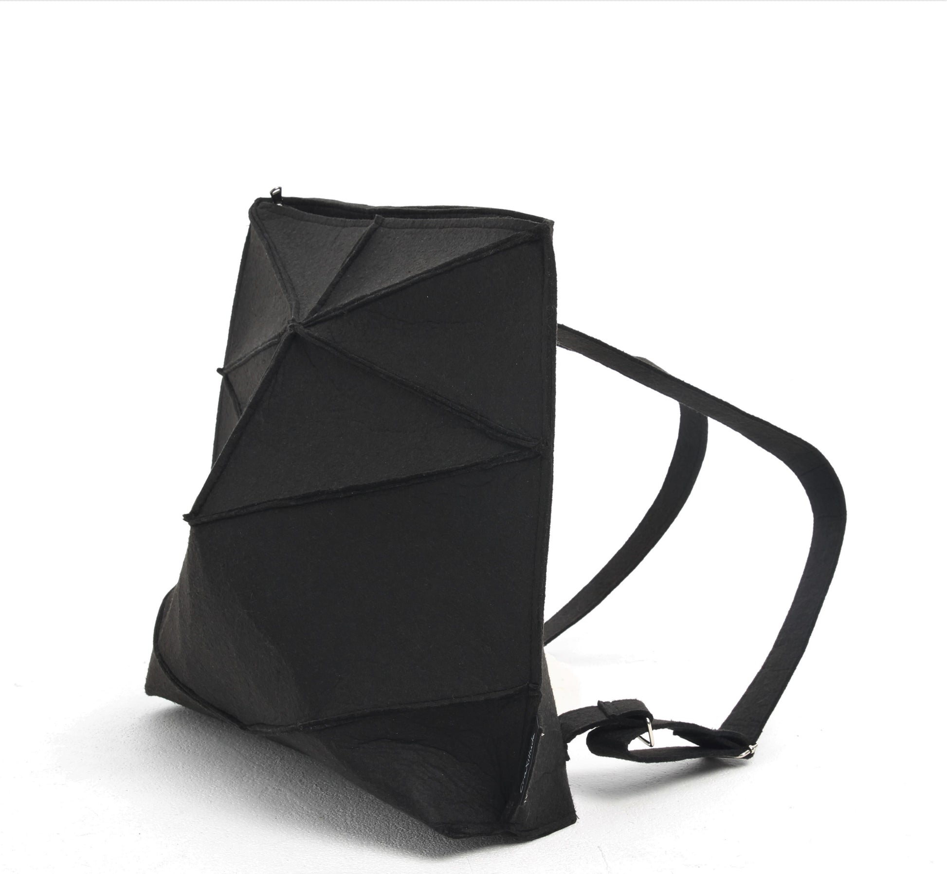 The backpack can be made of felt or pinatex, a vegan leather made from pineapple fibers. Pinatex is textured and durable, holding well the architectural structure of the backpack.