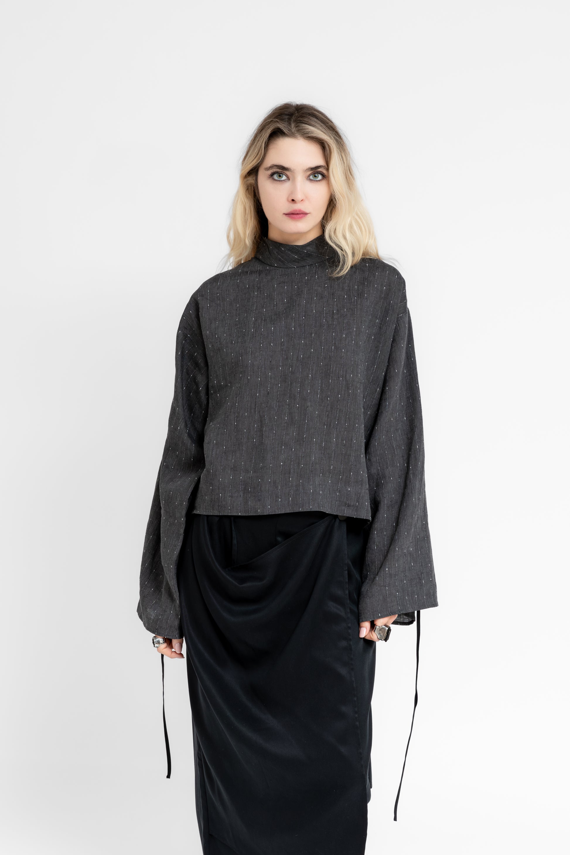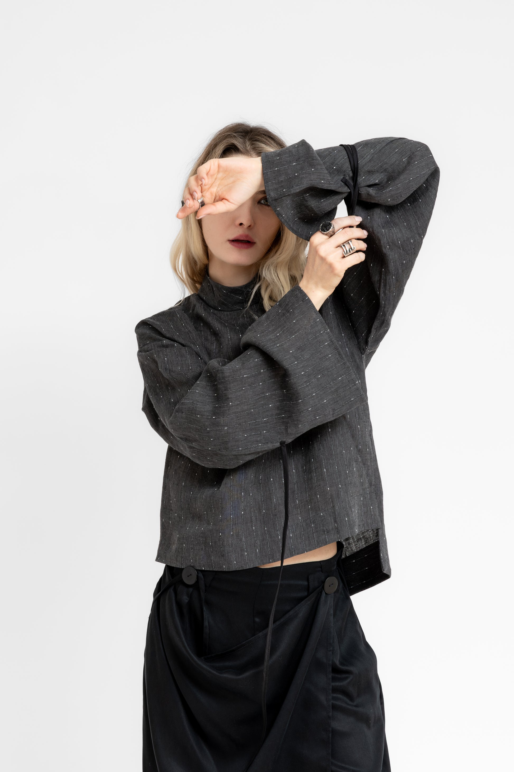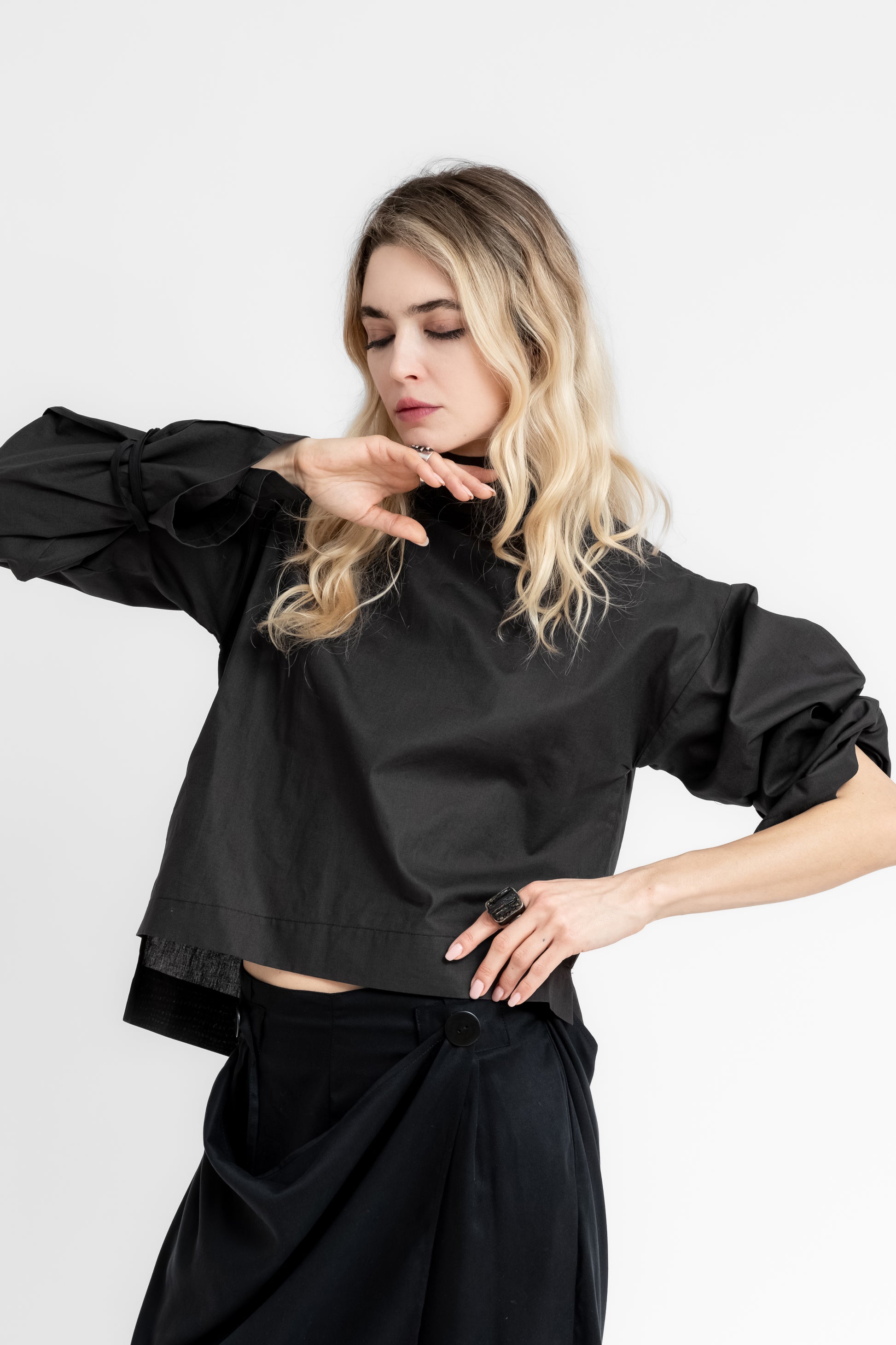 Transformer top/blouse with straps to wrap around the wrist allowing you to creatively play with its look. You can pull the straps through a loop hidden near the shoulder and adjust the sleeve's length. Styles with Urban Ninja trousers.