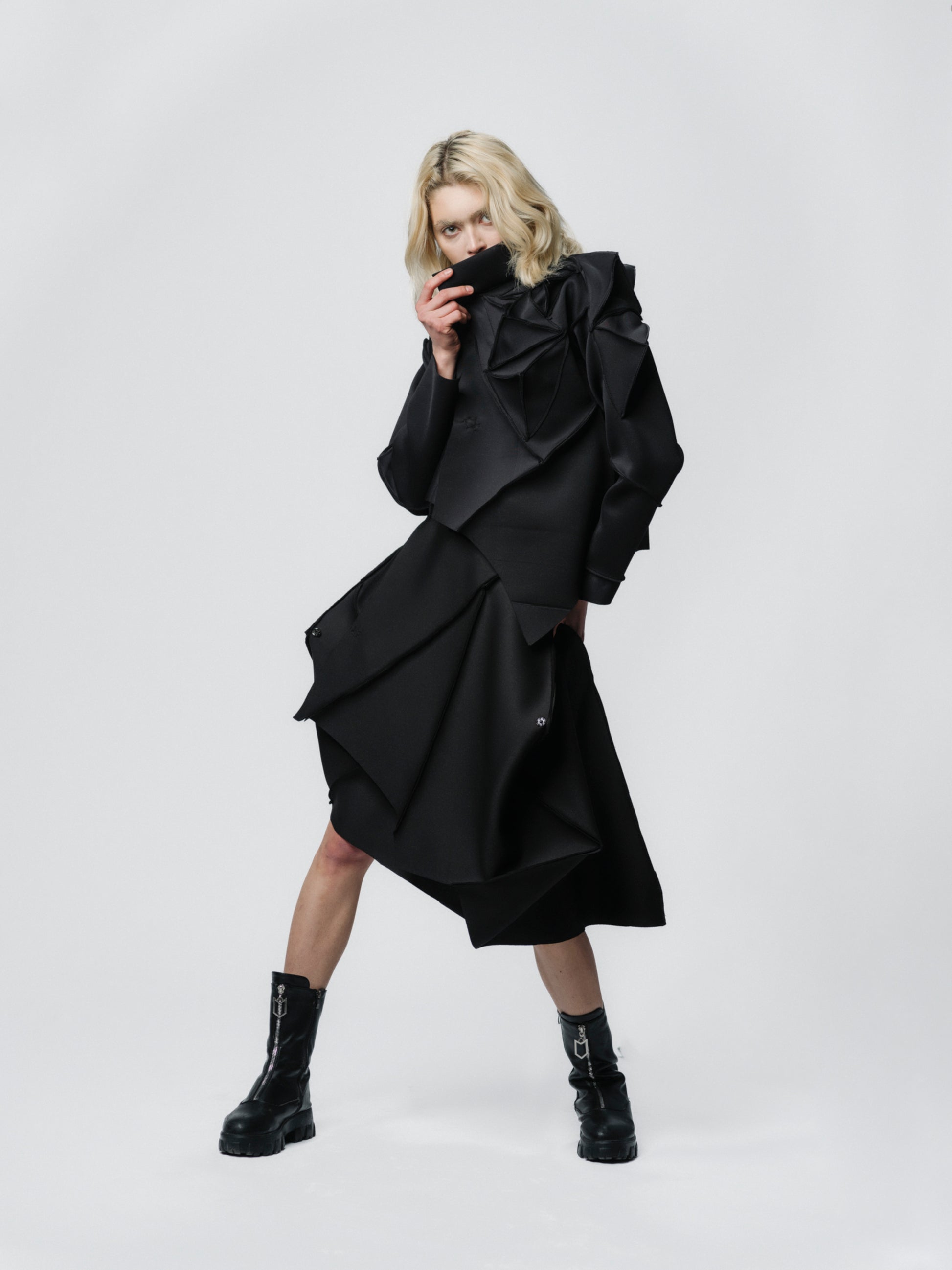 Experience avant-garde fashion with the Dominion Blazer, a neoprene (OEKO-TEX certified) blazer featuring sculptural details and asymmetric cuts. Designed for unconventional spirits, it pairs perfectly with the Out of Control skirt for a bold look.
